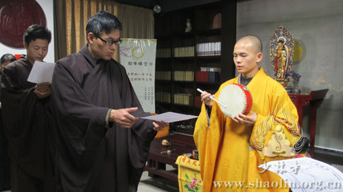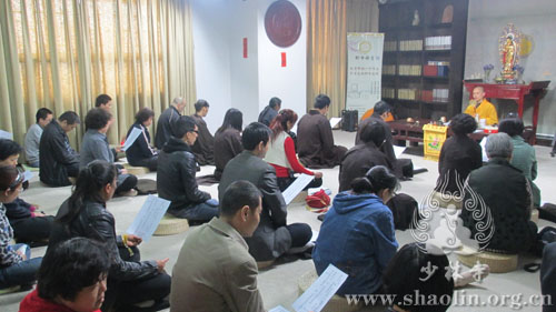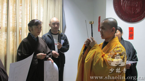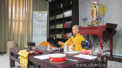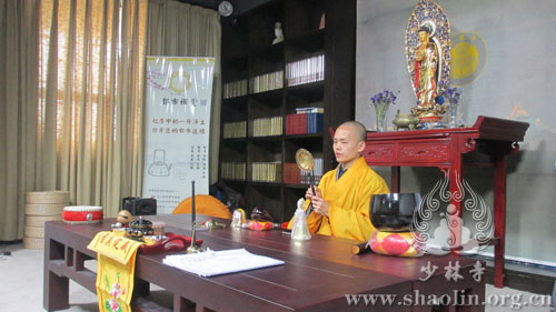 【本网讯】应都市禅堂唱赞班护法居士之邀,2014年4月20日上午,少林寺延融法师来到都市禅堂,为三十位同修进行汉传佛教法器的打法和用法的开示。