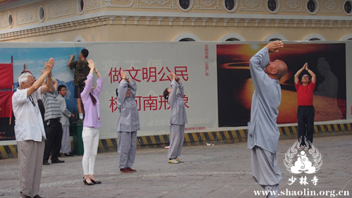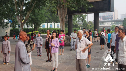 【本网讯】2014年6月24日一早,紫荆山公园内,由少林寺都市禅堂组织的免费教授“易筋经”、“八段锦”等少林功夫活动正式开始,吸引不少市民前来学习。