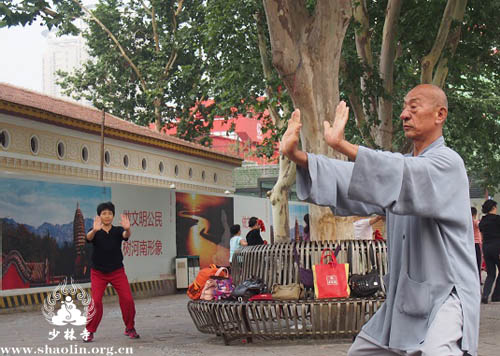 六十五岁的演慧法师曾习练少林功夫多年,此次受邀在郑州紫荆山公园连续10天向广大市民和功夫爱好者免费传授少林“易筋经”、“八段锦”等传统功法。