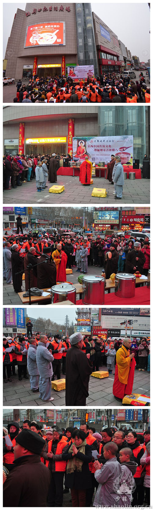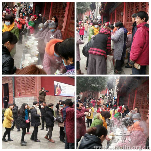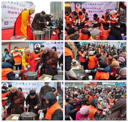 【本网讯】2015年1月27日(农历腊月初八)上午八点,在住持恒湛法师带领下,少林寺下院——焦作博爱县月山寺隆重举行“佛陀成道日——供佛祈福感恩施粥”法会,并在月山寺及焦作新世界生活广场两地同时布施少林腊八粥,传递佛教平等慈悲的理念,弘扬传统民俗文化。