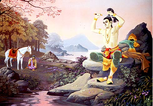 太子命侍从车匿将爱马犍陟牵出来,策马前行,彻夜不停。一路上人迹罕至,四周静寂之极。在密林深处,找到了他所理想的居所,太子削发改装为沙门(修道者),叫车匿将他削下的长发带回宫给父亲,作为纪念。