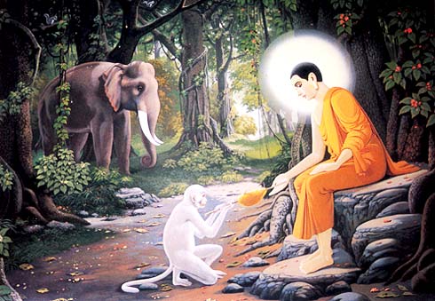 太子来到伽耶山苦行林中,开始过其艰苦日子。他在树下跏趺而坐,不分昼夜,不避风雨,不卧不起,一心修习禅定。有时山谷中的白猿摘取花果来供养。但他内心丝豪没有懈怠的念头。鸟儿飞来了,在他头上做巢抱卵,撒尿拉屎,他不嗔怒,也不加驱赶,心性泰然。