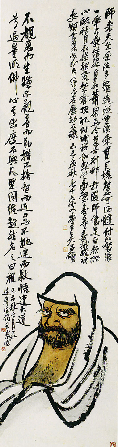 王一亭洗练的绘画语言,在其佛像写照中更显得从容不迫。逸笔草草、酣畅淋漓,不计工拙,然总能传佛像之神韵。这盖与其持戒念佛,勤修净业的修持功夫不无关系。正如金人赵秉文评价东坡所言:“横说竖说,无非般若”一样,王氏所画佛像,虽草率狼藉,然于会心传神处,则无不流露出慈悲喜舍的一派禅机。 此幅《达摩像》,构图险绝,于立幅之下方以篆籀之法写出头饰,再以细刻精雕状其面目,敷以淡彩,留出炯炯有神的双目,于是,达摩缄默严持的大威德相尽在眼前矣。右上方题跋为吴昌硕所书,疏疏落落,极尽枯劲之势。左二行为王氏自题,错综盘旋,与画之用笔如出一辙。二题均恰到好处,虽书犹画,一同章法,这也是此幅代作品之动人心魄处。