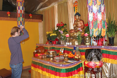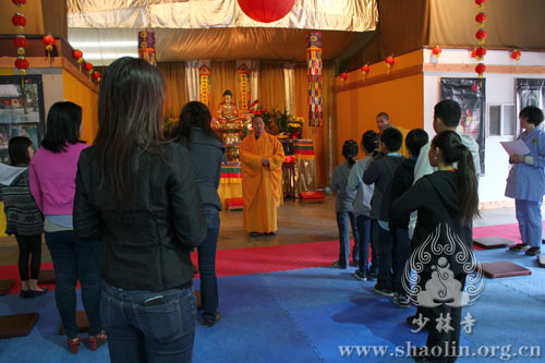 On February 9, 2013 (the eve of Chinese Spring Festival), the masters form American Shaolin Cultural Center made dumplings with the devotees together to let them experience joyous atmosphere of Chinese traditional festival. Then the Center held lamp lighting praying rite.
