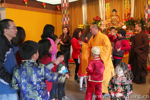 On February 10 (lunar New Year's Day), in the early morning, the disciples came to give their New Year’s greetings to their masters. In accordance with the traditional ritual, they offered incense and sacrifice for ancestors and prayed for flourishing Buddhism, peaceful world, healthy body and mind, study improvement. After the rite, Master Yanxu, chief of American Shaolin Cultural Center hand out red packets to the disciples.