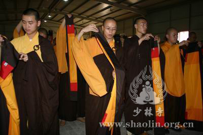 『本网讯』2007年5月29日(佛历二五五一年四月十三),上午,发三衣钵具。下午,由开堂和尚圣修长老教新戒弟子披衣展具。