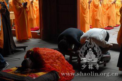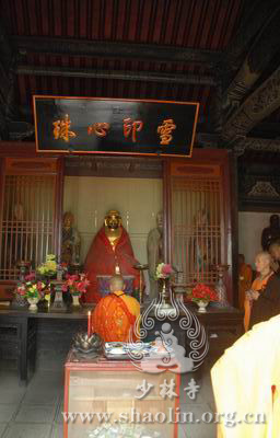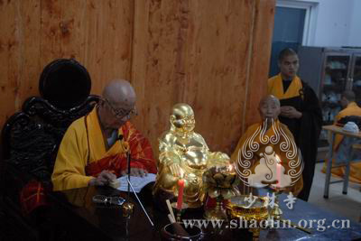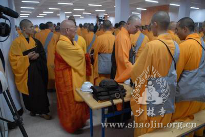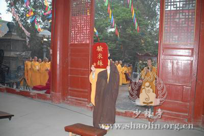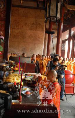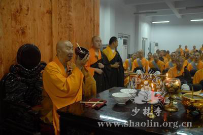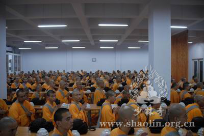 【本网讯】2007年5月31日(佛历二五五一年四月十五日),上午,挂结夏牌,上四圣供。下午,教授阿阇黎妙安长老在斋堂查验衣钵。随后开堂和尚圣修长老教新戒弟子吃钵饭。