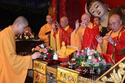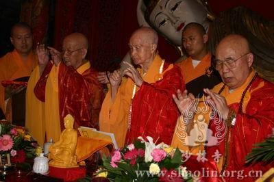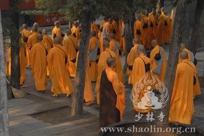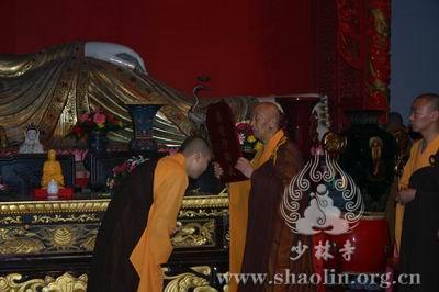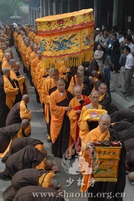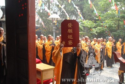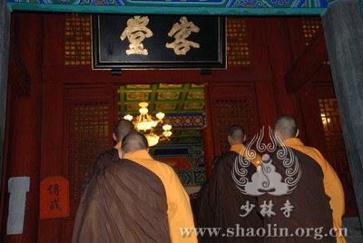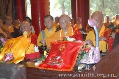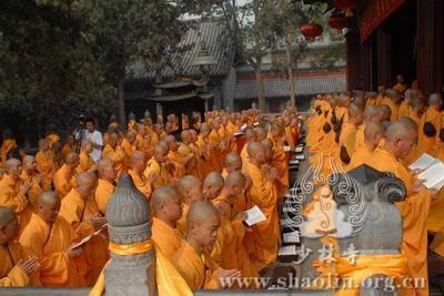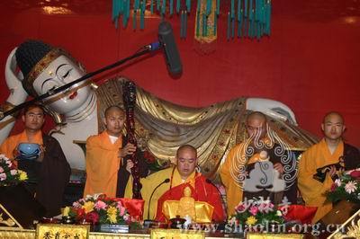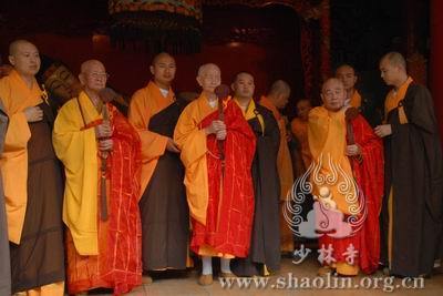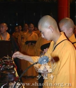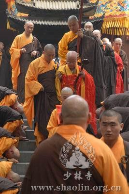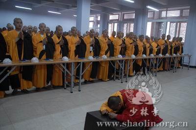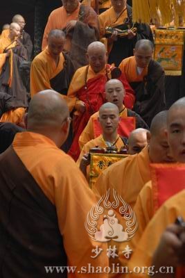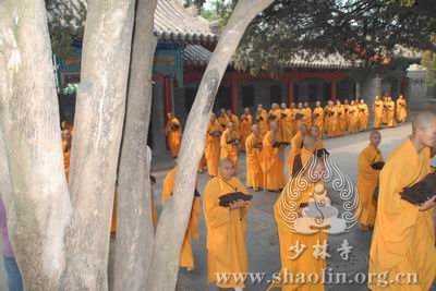 【本网讯】2007年6月3日(佛历二五五一年四月十八日),上午7时30分,丁亥年中国嵩山少林寺传授三坛大戒法会正授沙弥十戒。 上午十点,新戒弘凯、慧维、道寂及北京护法居士为祈愿戒期圆满、佛事成就奉设上堂大斋供养十方佛法僧三宝。 下午2点,授经阿阇黎本如法师为新戒沙弥讲授沙弥十戒二十四威仪。 晚上,发愿巡寮。