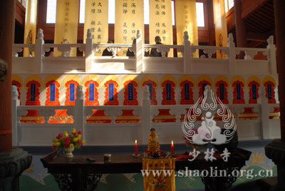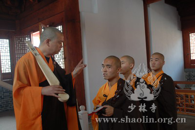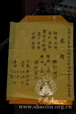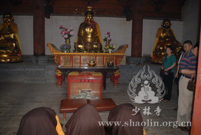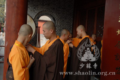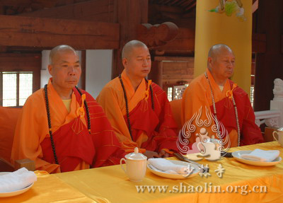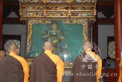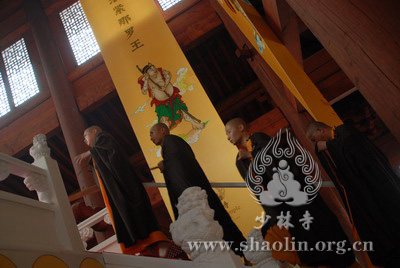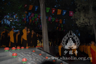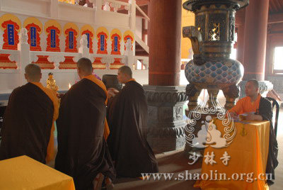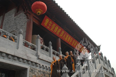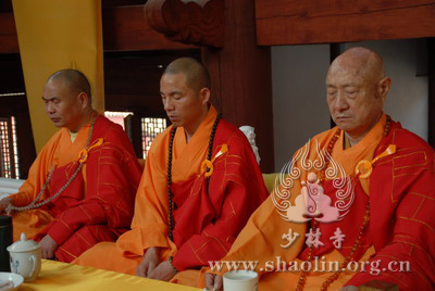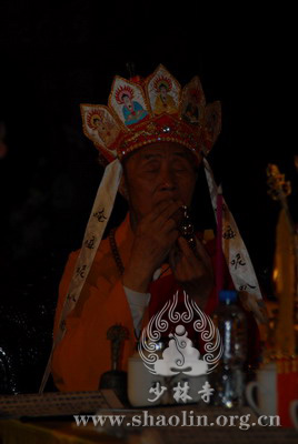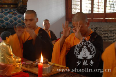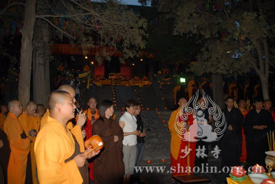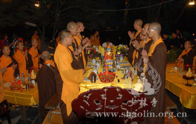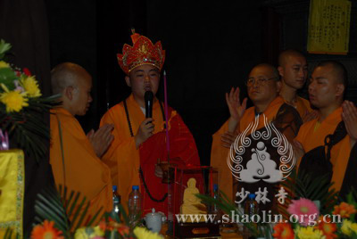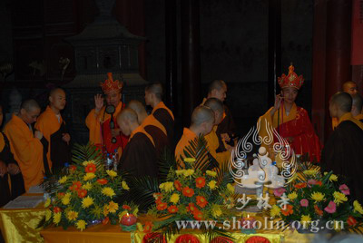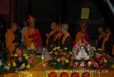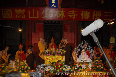 『本网讯』2007年6月11日(佛历二五五一年四月二十六),少林寺传授三坛大戒法会授比丘戒 第三天。晚上六时,开堂和尚圣修长老领觉三法师等诸纠察师及常仁法师等引礼师在西方圣人殿代为新戒施放五大士焰口道场。