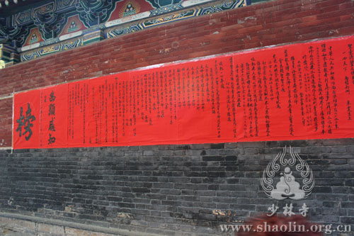 立雪堂侧墙上,张贴着“幽显咸知”的文疏,即“合行榜示,幽显咸知”。相信在各位法师及功德主的护持下,这次庄严隆重的水陆空胜会道场一定能达到预期的目标,使法会如法如仪,圆满成就,存亡两利。