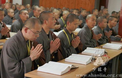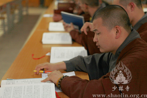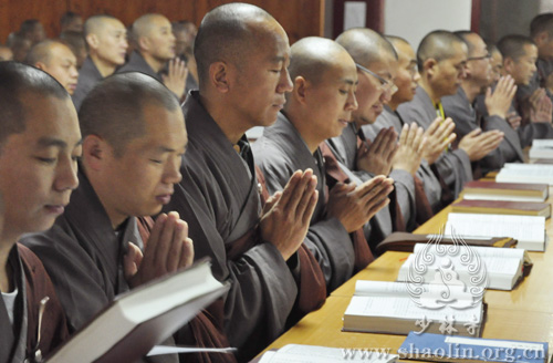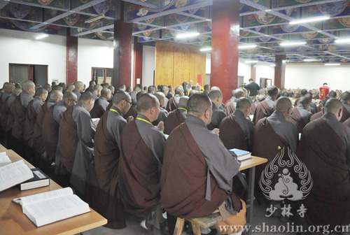 本网讯(记者 于雷 摄影 蔡赫)2013年5月9日,农历三月三十,少林寺癸巳年传授三坛大戒法会进入第二十一天,当日的活动为:讲四分律、诵戒羯磨。
