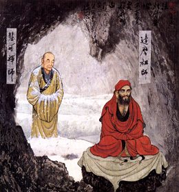 Huike(487-593) the Second Patriarch of Zen Buddhism was the first disciple of Bodhidharma. He had been called Shenguang and a scholar in Buddhist scriptures and classical Chinese texts. He went through much suffering came to Shaolin Monastery and was eager to take Bodhidharma as his teacher, but was refused initially. Not getting disheartened, he stayed by Bodhidharma when the master practiced his "wall-gazing" in the cave. One winter day Bodhidharma practiced zazen in the backyard till midnight when snowed. Shenguang stood outside all night. In the morning Bodhidharma saw Shenguang still stood there with snow reached his knees, he asked him why he was there. Shenguang replied that he wanted Dharma from Bodhidharma. Bodhidharma refused saying,"Only if the snow was red." Shenguang pulled out a knife and cut off his left arm, his blood splashed on the snow. Bodhidharma was moved by his resolve, then accepted him as a student, and changed his name to Huike.